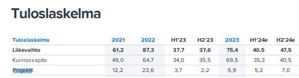 Yhtiö arvioi tilikauden 2024 liikevaihdon kasvavan (75,4 miljoonaa euroa vuonna 2023) ja tilikauden suhteellisen liiketuloksen (EBIT-%) paranevan (5,5 prosenttia vuonna 2023) viime tilikauteen verrattuna. (muuttumaton, julkaisu 26.2.2024)