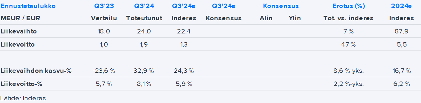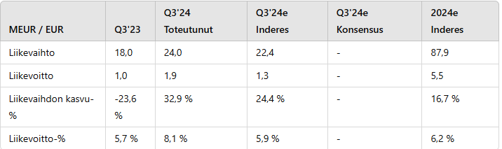 Yhtiön liikevaihto nousi vertailukaudesta 33 % ja oli Q3:lla 24 MEUR ylittäen ennusteemme (ennuste: 22,4) 7 %:lla.
