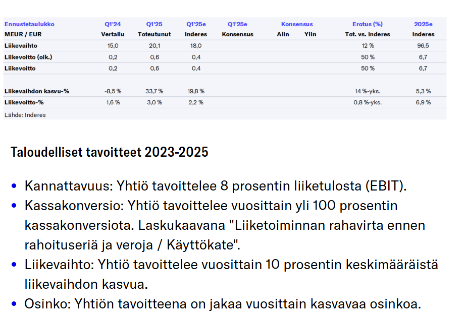 Vuodesta 2018 vuoteen 2024 liikevaihto on kasvanut 31 MEUR:sta 92 MEUR:oon eli keskimäärin melkein 20 % vuodessa. Ei yhtään hassummin. Toki osa tästä on ollut epäorgaanista kasvua. En muista oliko puhetta kuinka iso osa.