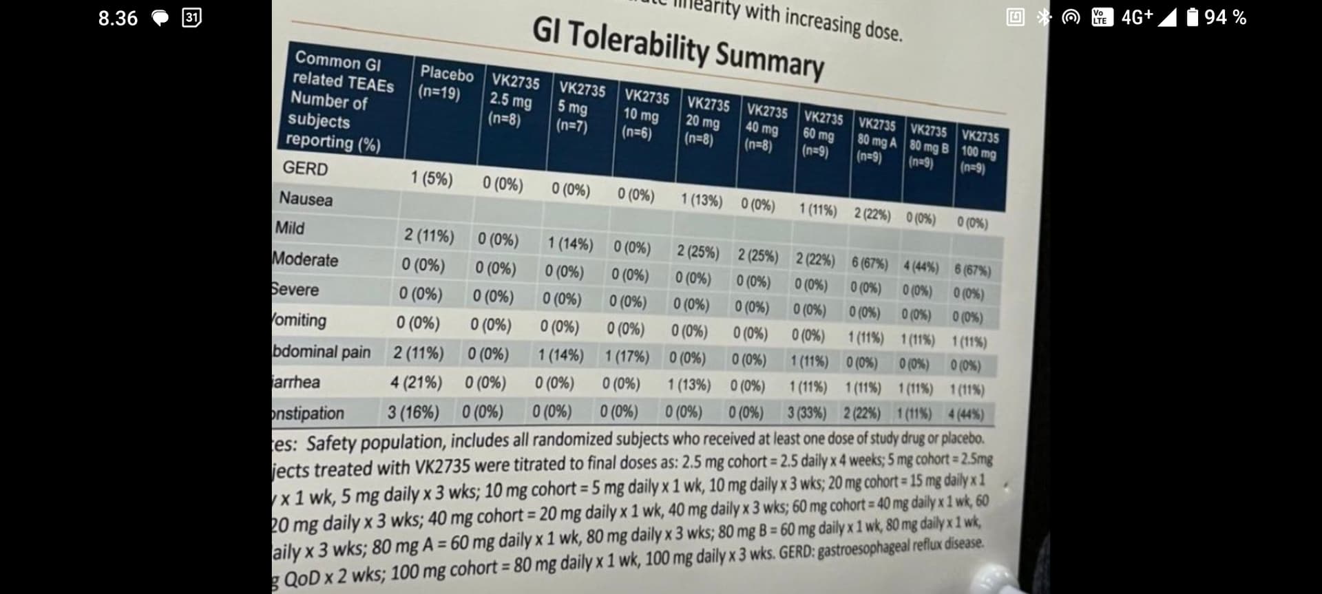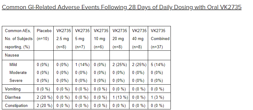 "Among patients receiving VK2735 in the VENTURE study, the majority (92%) reported drug related TEAEs as mild or moderate in severity. The majority of TEAEs that were gastrointestinal (GI) in nature (95%) were also reported as mild or moderate. Nausea was reported among patients receiving both VK2735 (43%) and placebo (20%). Among subjects receiving VK2735, the majority of reported nausea (68%) was characterized as mild (32% moderate, none severe). Vomiting was reported in 25/140 (18%) VK2735-treated patients compared with none reported among patients receiving placebo. GI-related adverse events were generally observed early in treatment, with decreasing frequency upon repeat dosing. Across the combined VENTURE study arms, the weekly rate of nausea did not exceed 5% at any point after the first week of treatment. One patient receiving VK2735 experienced a serious adverse event (SAE) of dehydration that was characterized as related to study drug.
