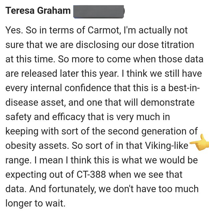 Perustin tälle yritykselle ketjun, kun ei ole näköjään aikasemmin tästä paljoa puhuttu. Kyseessä on siis Viking Therapeutics, jotka ovat lihavuuslääkettä VK2735 kehittävä yhtiö Faasi 3:seen menossa. Osake on mielestäni merkittävästi aliarvostettu, koska testitulokset näyttävät, että lääkkeellä on markkinoiden paras siedettävyys ja myös merkittävä painonpudotusefekti. Viking Therapeutics on hyvin johdettu ja heillä on reilusti kassaa (n. miljardi $) suorittaa Faasi 3. Yhtiö itse on sanonut tavoittelevansa, että Big Pharma ostaa heidät.