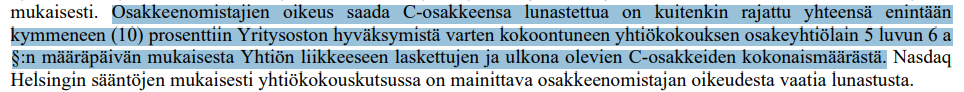 Lisäksi jos toteutetaan suunnattu osakeanti, jonka seurauksena C-osakkeiden lukumäärä kasvaa enintään edellä kuvatun Viralan laimennussuojan enimmäismäärään (yhteensä 18,00 miljoonaa ulkona olevaa C-osaketta) asti, E-sarjan osakkeita muunnetaan yllä kuvatulla tavalla automaattisesti F-sarjan osakkeiksi C-osakkeiden lukumäärän kasvua vastaavassa suhteessa, mikä tarkoittaa, että Viralan ääniosuus laimenee vähemmän kuin muiden osakkeenomistajien. Jos puolestaan C-osakkeita lasketaan liikkeeseen suunnatussa osakeannissa enemmän kuin edellä kuvatun Viralan laimennussuojan enimmäismäärän (yhteensä 18,00 miljoonaa ulkona olevaa C-osaketta) asti, Viralan ääniosuus laimenee laimennussuojan ylittävältä osalta samassa suhteessa kuin muiden osakkeenomistajien.
