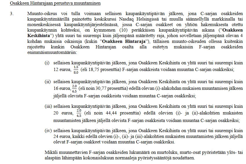 Listautumisannin kolmanteenvuosipäivään saakka ja sillä edellytyksellä, että Yhtiöllä on ulkona olevia F-sarjan osakkeita, E-sarjan osakkeita muunnetaan automaattisesti F-sarjan osakkeiksi, jos C-osakkeiden lukumäärä kasvaa sellaisen C-osakkeiden annin vuoksi, jossa F-sarjan osakkeiden osakkeenomistajille ei myönnetä merkintäetuoikeuksia.