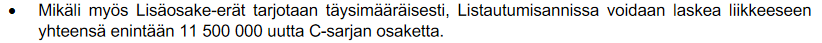 Kyllä siinä oli juurikin tuollainen pykälä, mutta se dilutaatiosuoja oli sille Viralan “bonarille”, ei sen C-osakkeille. Eli se osakkeentuottoon sidottu bonus perustaosakkeista (0-8% sidottuna tuottoon) on prosentuaalinen 18 miljoonan osakkeen rajaan saakka. Aika todennäköisessä skenaariossa taisi olla lähtötaso n. 10-11 miljoonaa osaketta. Eli Viralan alussa merkaamat 3-3.5 miljoonaa c-osaketta eivät nauti mitään suojausta.