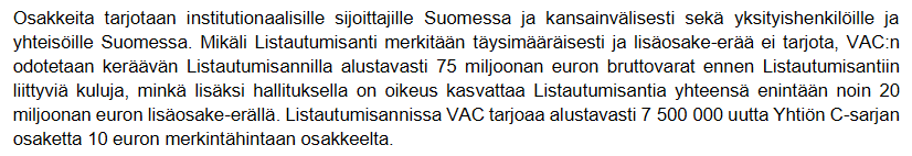 Osakkeita tarjotaan institutionaalisille sijoittajille Suomessa ja kansainvälisesti sekä yksityishenkilöille ja yhteisöille Suomessa. Mikäli Listautumisanti merkitään täysimääräisesti ja lisäosake-erää ei tarjota, VAC:n odotetaan keräävän Listautumisannilla alustavasti 75 miljoonan euron bruttovarat ennen Listautumisantiin liittyviä kuluja, minkä lisäksi hallituksella on oikeus kasvattaa Listautumisantia yhteensä enintään noin 20 miljoonan euron lisäosake-erällä. Listautumisannissa VAC tarjoaa alustavasti 7 500 000 uutta Yhtiön C-sarjan osaketta 10 euron merkintähintaan osakkeelta.
