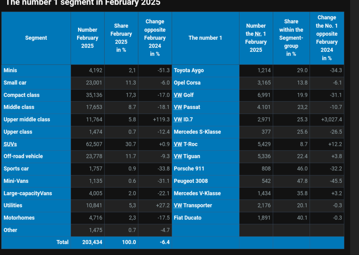 The segment leaders for February’s figures have been published, and Volkswagen swept the gold medal positions. The ID.7 distorts the year-on-year comparison percentages for the upper mid-range segment and appears to be the only electric car among the segment leaders.