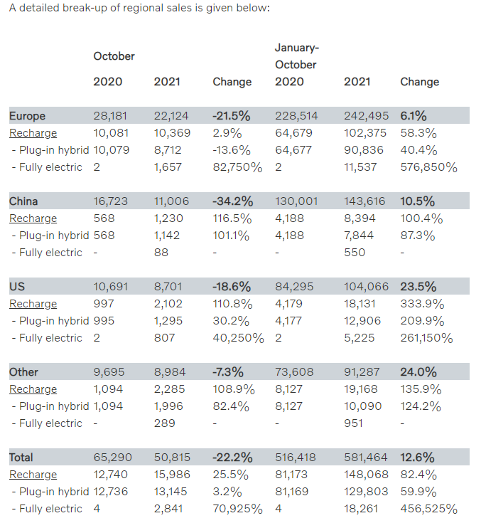 Lokakuussa Volvo Carsin maailmanlaajuinen myynti oli 50 815 autoa, mikä on 22,2 prosenttia vähemmän kuin vastaavana ajanjaksona viime vuonna. Lasku johtui komponenttipulasta, joka vaikutti tuotantoon, mutta Volvo Carsin tuotteiden kysyntä pysyi vahvana.