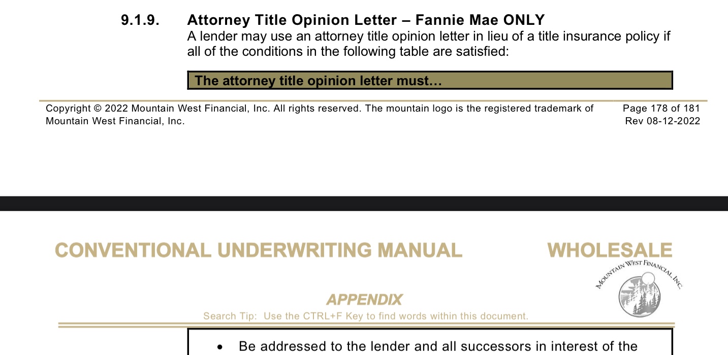 The GSEs have expanded underwriting flexibilities to permit lenders, in limited circumstances, to obtain an attorney title opinion letter in lieu of a lender’s title insurance policy. See AmeriHome Correspondent Product Announcement 20220904-CL – GSE Overlay Removal - Attorney Title Opinion Letter for impacts to AmeriHome guidelines.
