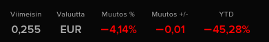 Tampereen Ilves took bronze, but Tappara was the team being cheered for here anyway. More and more content regarding the company and less hockey has started appearing on Modulight’s CEO’s social media. No more accounts receivable bombs appeared. Projects moving to the commercial phase has indeed been sluggish, and the stock price has behaved accordingly: YTD -39.1%.