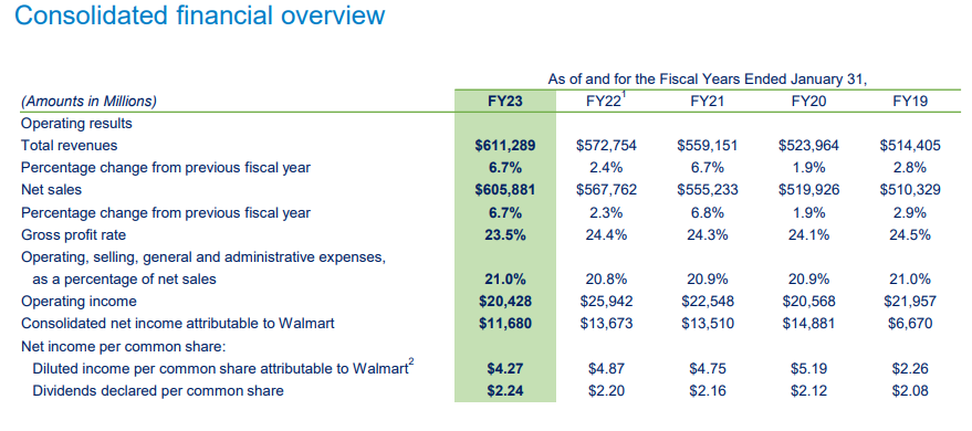 Walmarts omsætning steg med 5,5 procent og nåede 169,6 milliarder dollars. Den justerede indtjening pr. aktie var 0,58 dollars. EBITDA steg med 8,2 %, hvilket skyldtes forbedrede avancer og mindre tab på e-handel (eCommerce).