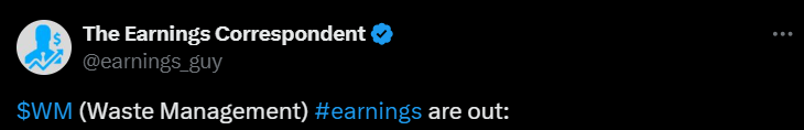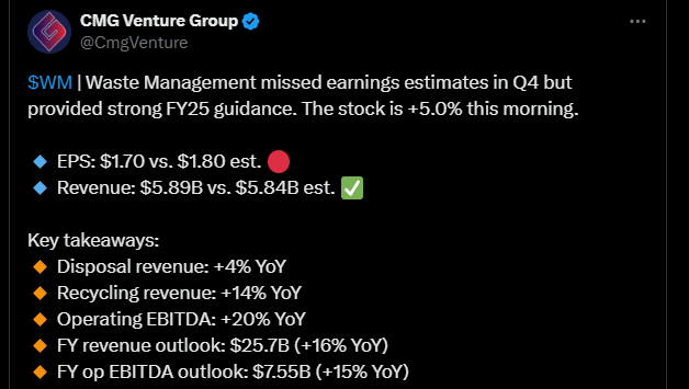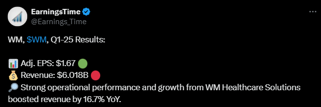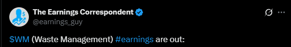 Waste Management rapporterade sina resultat; resultatet och omsättningen låg något under marknadens förväntningar, men båda växte ändå från föregående år.