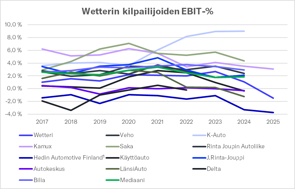 År 2024 var medianen för EBIT-% i urvalet 1,8 %, medan den under åren 2017–2022 har varit 2,3–3,4 %. Jämfört med de nivåerna är den EBIT på 2 % som du nämnde inte längre särskilt märkvärdig, men givetvis accentueras de bolagsspecifika skillnaderna. År 2025 var svagare än föregående år för de vars siffror redan är offentliga (dvs. Wetteri, Hedins finska verksamheter och Kamux finska verksamhet), vilket återspeglar hur djupt bilbranschen stampar just nu. Givetvis utmärker sig K-Auto här och har lyckats förbättra sin lönsamhet till en mycket hög nivå till skillnad från resten av branschen, vilket understryker bolagets konkurrenskraft.