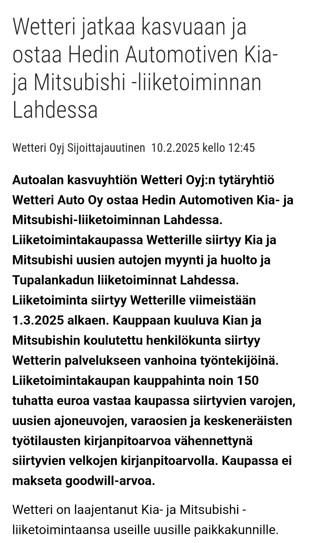 Tämä on musta järkevän oloinen liike, kun selvästi halutaan laajentaa Kian ja Mitsubishin edustuksia mahdollisuuden salliessa. Wetterin mittakaavassa matala kauppahinta eikä liikearvostakaan makseta, joten en näe erityistä riskiä että voitaisiin mennä pahasti metsään. Vastakohtana ehkä investoinnit konekauppaan, jossa rakennetaan täysin uutta liiketoimintaa ja tuotot vaativat vielä tuntuvaa kasvua suurempaan kokoluokkaan.