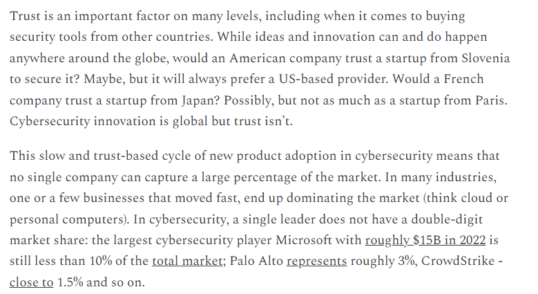 Maailmalla on omat WithSecurensa (joihin paikallisina luotetaan) + muutama globaali jätti + paljon erittäin massiivisesti rahoitettuja scale-uppeja. Lisäksi kyberturvallisuus on alkanut olla entistä enemmän Google/Apple/Microsoftin ongelma, jolloin lisäratkaisujen tarve pienenee. Jäljelle jää konsultointi, joka ei skaalaudu…