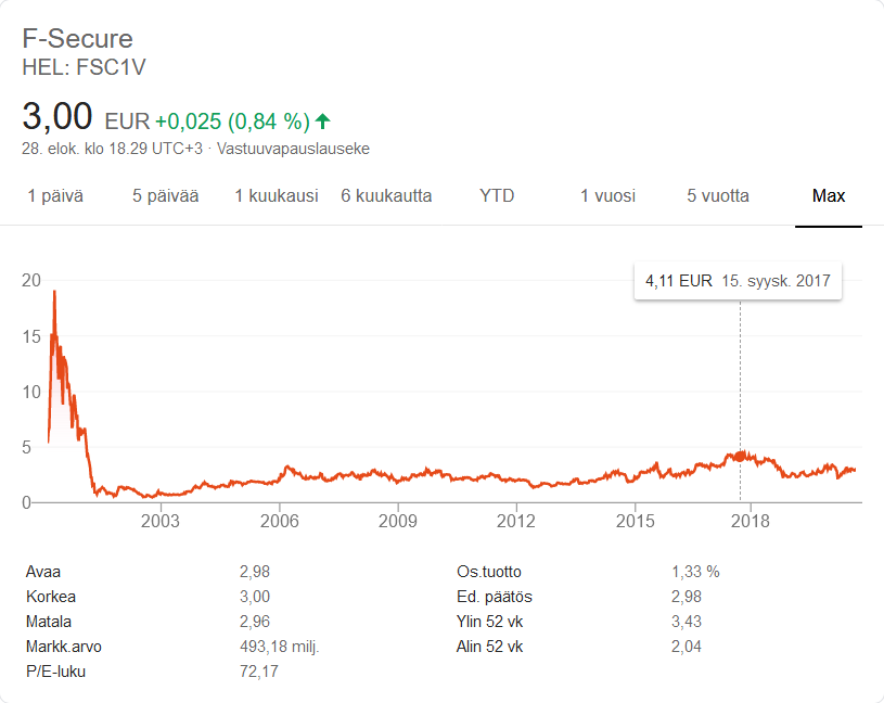 F-securen kyydissä oltu vuodesta 2017-18 asti 3,10 hinnalla…