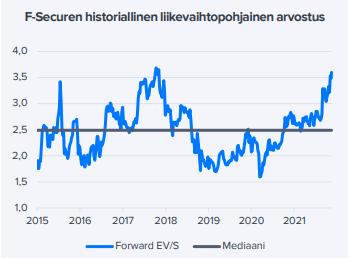 Yksi tekijä kurssinousun taustalla on teknologiasektorin yleisesti nousseet arvostustasot, mikä on viimeisen reilun vuoden aikana heijastunut myös F-Securen arvostukseen. Liikevaihtokerroin on elpynyt nyt koronapohjista suunnilleen 7 vuoden huipputasoille.