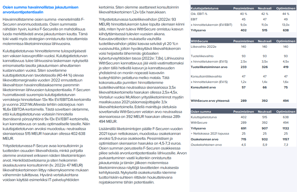 F-Securen jakautuminen herättänyt melko vähän keskustelua täällä. Hahmottelin eilen illalla jakautumisen mahdollistamaa arvonluontipotentiaalia päivitetyssä osien summa -laskelmassa. Tässä premium-raportista omat pohdinnat aiheen tiimoilta.