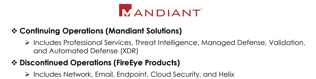 Mandiant kulki pörssissä aiemmin nimellä FireEye, kunnes viime vuonna FireEyen tuotebisnekset myytiin McAfeen yritysbisnekselle 1,2 miljardin dollarin kauppahinnalla. Tässä sijoittajapresiksestä jaottelu näiden välillä: