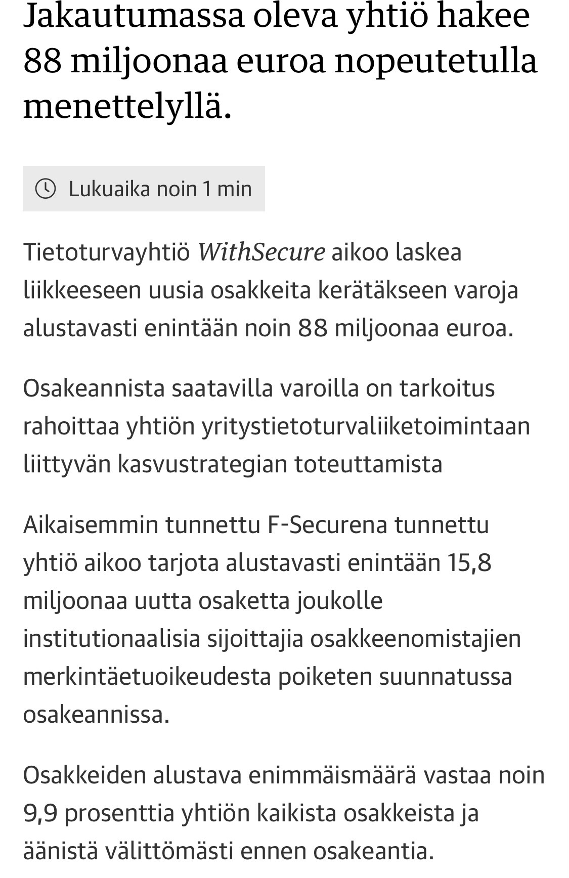 Taitaa olla niin että tämä nykyinen WithSecure on kuluttajatuotteita ja (uusi) F-secure on sitten yritysten tietoturvaa. Olisi kiinnostava kuulla mitä nykynäkymien valossa tuo merkitsee. Uudesta, irti lohkeavasta firmasta saa osakkeen kutakin nykyista WithSecure osaketta kohti. Miten ennakoidaan muodustuvan