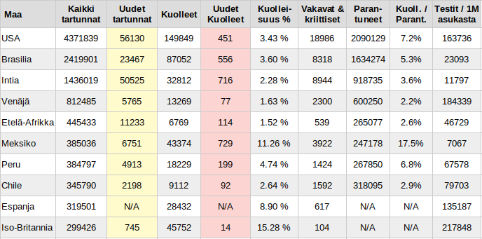 Uudet tartunnat(+216300) laskivat eilen matalimmilleen viikon aikana ja kuolemantapaukset(+4100) olivat selvässä laskussa. Se ei kuitenkaan estänyt Intiaa tekemästä uutta päiväkohtaista tartuntaennätystään. Tilanne taudi kärkilistan ulkopuolella on tasainen. Joukosta erottuu ainoastaan muutama maa, kuten Kolumbia(+8181) ja Argentiina(+4192), joissa epidemia on kehittynyt hallitsemattomaksi viime viikkoina. Positiivisena kehityksenä voi pitää Intian naapurimaiden Bangladeshin(+2275) ja erityisesti Pakistanin(+1226) tartuntojen määrän laskua, mikä on jatkunut jo muutaman viikon.