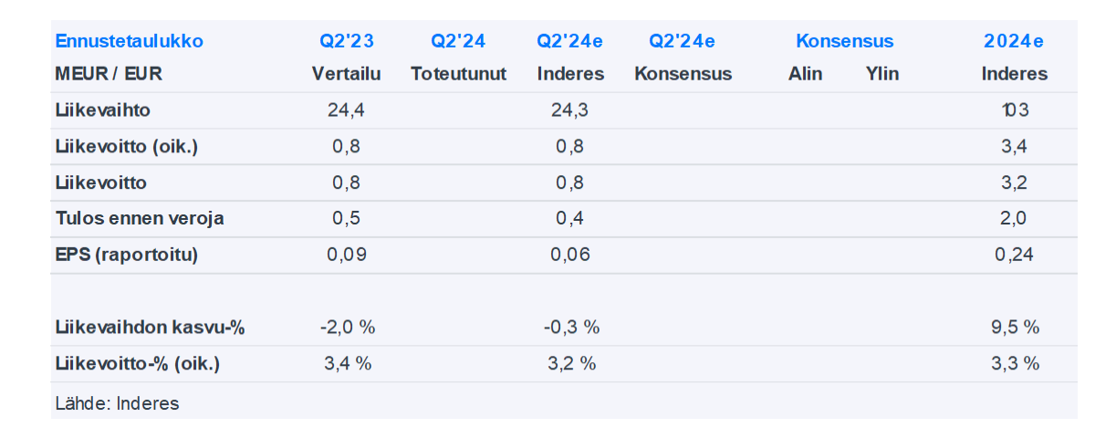 Wulff made no changes to its guidance and expects 2024 revenue to grow (2023: EUR 93.8 million) and comparable operating profit to be at a good level (2023: EUR 3.5 million). Growth is expected from service operations this year, but the outlook for product operations remains challenging due to the general weakness of the economic situation. However, the improving performance of Wulff Works, the realization of synergies from acquisitions, and savings from change negotiations should, in our assessment, support the result.