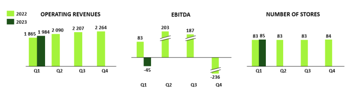 XXL further announces that total operating revenue so far in the second quarter 2023 is lower than last year, driven by weak consumer sentiment and reduced demand for sporting goods in general. Total operating revenue, from continued operations, for the Group in Q2 2023 is expected to be around NOK 1.9 billion compared to NOK 2.1 billion last year. The market is characterized by high inventory levels in the whole value chain, resulting in aggressive pricing and excessive campaigns. Higher campaign and clearance activities for XXL will impact the gross margin, which is expected to be around 30-32 per cent (37.9 per cent). EBITDA is estimated to be in the range of negative NOK 25 to 75 million (NOK 205 million). This could change as the last weeks of June are important sales weeks.