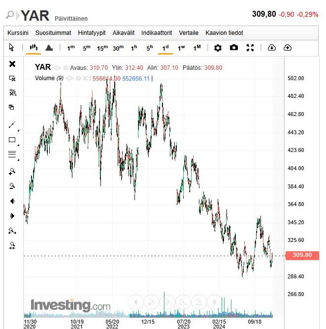 Yara (YAR) Hintatavoite 425 NOK Yara on raportoinut odotettua parempia lukuja kolmen viimeisen vuosineljänneksen aikana, ja negatiivinen tulosodotusten trendi näyttää nyt kääntyvän ylöspäin. Tämän vahvistaa se, että myös negatiivinen osakekurssitrendi on kääntynyt ylöspäin. Johdon kommentit vahvistavat, että pääomavaltaiset vihreät investointiprojektit, joiden kannattavuus on rajallinen, saatetaan peruuttaa. Jos ne peruutetaan, tämä voisi tarjota mahdollisuuksia korkeampiin osinkoihin. Osake käy 1,0-kertaisella kirjanpitoarvolla ja suoralla 6 %:n tuotolla (jossa on nousupotentiaalia, jos investointeja leikataan), mikä on mielestämme houkuttelevaa.