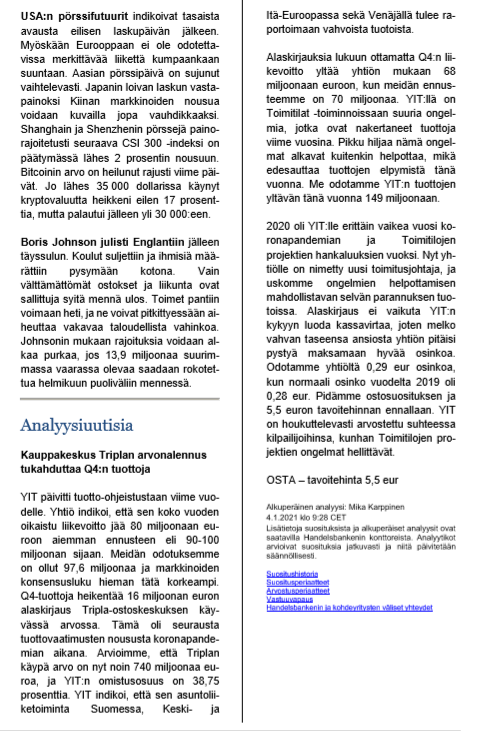 No onneksi on kuitenkin suurin, vahvin ja kaunein; YIT! Ensin todettiin ettei anneta edes ohjeistusta ja ohjeistuksen jälkeen puoleen vuoteen on onnistuttu antamaan kaksi negaria! Äärimmäisen tyylikkäästi hoidettu. Ensin annetaan ohjeistushaarukka ja sitten ei osuta edes sen alalaitaan. Vielä kun vähän venyttää joulukuulta, niin näköjään onnistuu antamaan 2020 negatiivisen tulosvaroituksen 2021 puolella ja oikein juhlatunnelmissa vuoden ensimmäisenä pörssipäivänä.