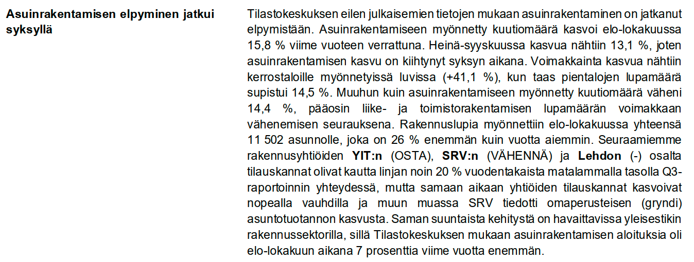 Taitaa tammiralliväelle tulla myyntipainetta, Lepikönkin salkusta tätä löytyy tuoreena ostoksena ja tuskin pitkään holdiin. Yhdyn kyllä mielipiteeseen, että jokin suomalaisessa rakennussektorissa mättää, Lehdosta otin aikanaan kunnon turskat ja nyt olen Constin kyydissä, mitähän sieltä on tulossa🙂!?