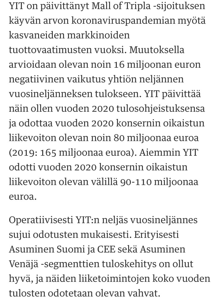 Toivottavasti koukataan isosti miinukselle että pääsisi katsomaan ostopaikkaa. Sikäli oon samaa mieltä kuin mitä @Ummon kirjoitteli, mutta toisaalta on selvästi kertaluonteinen erä. Mutta miksi tätä ei ole voinut huomioida aikaisemmin - yllätys? Ei nyt kuitenkaan. Ei paranna tällainen luottamusta vaikka kyllähän YIT:n tulisi olla sektorin paras toimija.