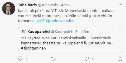 “Haluan kiittää Kari Kauniskangasta hänen pitkästä työurastaan yhtiön palveluksessa. YIT on läpikäynyt merkittävän muutoksen viime vuosina. Kari on tehnyt tinkimätöntä ja sitoutunutta työtä muun muassa Lemminkäinen-fuusion jälkeisessä mittavassa integraatiossa ja Pohjoismaiden päällystys- ja kiviainesliiketoimintojemme myynnissä. YIT on vakaa ja vahva yhtiö ja toimialansa edelläkävijä. Karin syvä toimialatuntemus ja innostava johtamisote ovat olleet korvaamattoman tärkeitä yhtiön uudistumisprosessissa”