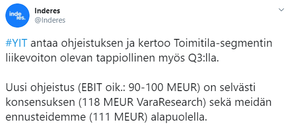 Ilman tuota 25 MEUR:n Toimitilojen negatiivista vaikutusta, yhtiön Q3 tulos olisi ollut 41 MEUR, joka oli myös meidän ennusteemme ennen tiedotetta.