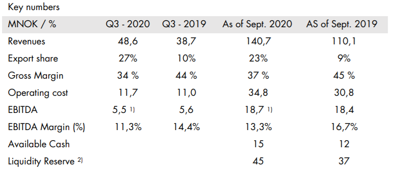 Tänä vuonna liikevoittomarginaali on väliaikaisesti hieman alempi. Q1-Q3 liikevoittomarginaali on ollut 13,3%. Oletetaan, että liikevaihto kasvaa tänä vuonna ennusteen alarajan verran eli 25%. Tällöin vuoden 2020 liikevaihto olisi 195MNOK. Oletetaan, että loppuvuoden ajan EBITDA pysyy Q3 tasolla tai laskee hieman ollen 5,3MNOK ja näin ollen koko vuoden EBITDA olisi 24MNOK. Tästä laskien EBITDA-marginaali olisi 24/195 eli 12,3%.