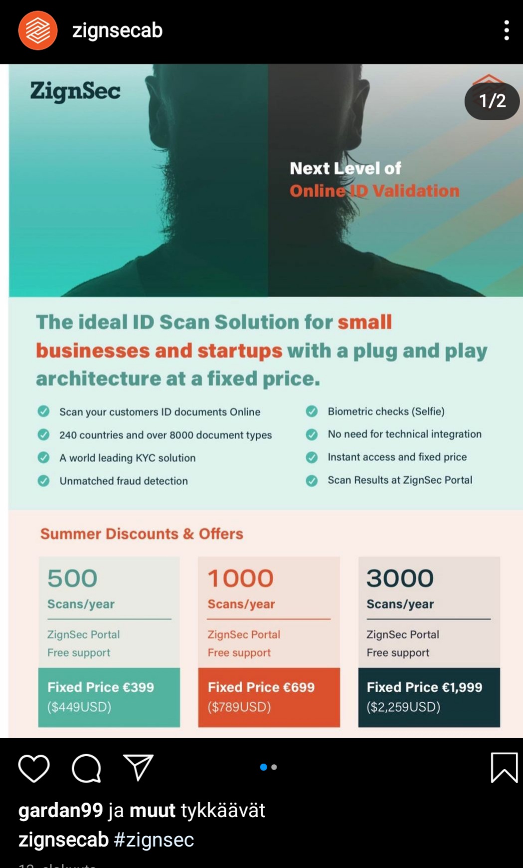 tuo hinnoittelu → esim. 30,000 skannausta / 15K€ eli 50 senttiä per skannaus. Yksi skannaus lienee tarkoittaa yhtä henkilöllisyyden todentamista? äkkiseltään tuntuu kovalta hinnalta? mutta kauppa sen kun näyttää käyvän… toki isoille asiakkuuksille, joilla satoja tuhansia / miljoonia asiakkaita, ja kenties yhtä paljon skannauksia(?), varmasti oltava ihan eritasoinen transaktiokustannus?