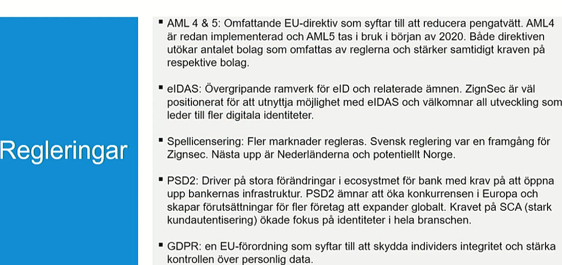 Det handlar fortfarande om ett mycket litet (omsättning 2019 7 MSEK) och olönsamt, men snabbt växande företag som erbjuder olika elektroniska tjänster relaterade till identitetsverifiering. Bolaget grundades 2015 och IPO:n var för exakt ett år sedan i oktober 2019. Zignsec har kunder från flera olika branscher, t.ex. online spelföretag, fysisk åtkomstkontroll, banker, e-handel.. kundbasen och branscherna expanderar ständigt.