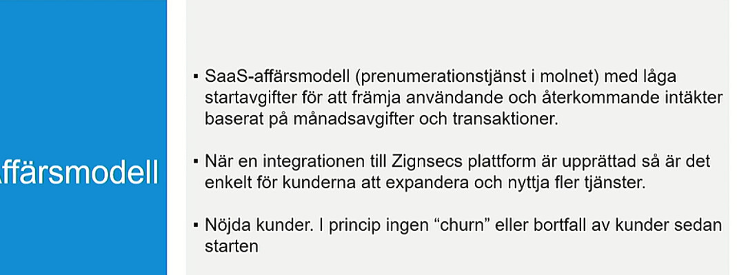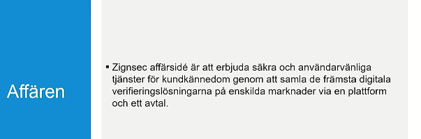 Affärsmodell: ZignSec har byggt en plattform för att kombinera autentiseringsmetoder i olika länder, som kan användas för att digitalt verifiera användare i realtid över hela världen via en enda integration, inom flera olika branscher. En kund kan integrera sig med endast ZignSecs plattform för att kunna verifiera kunder i flera olika länder, istället för att integrera med lokala leverantörer i varje land.