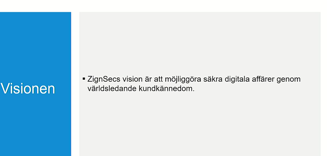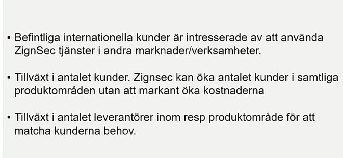Zignsec erbjuder faktiskt koncept för elektronisk identifiering etc. Avancerad, enkel och lättanvänd identifiering krävs på grund av IT-säkerhet och digitalisering. Här är ZignSecs marknad och möjlighet. Konkurrens finns säkert även inom detta område. Tiden får utvisa om Zignsec lyckas? Jag äger lite av detta. För mig är det lite som ett lotteri.