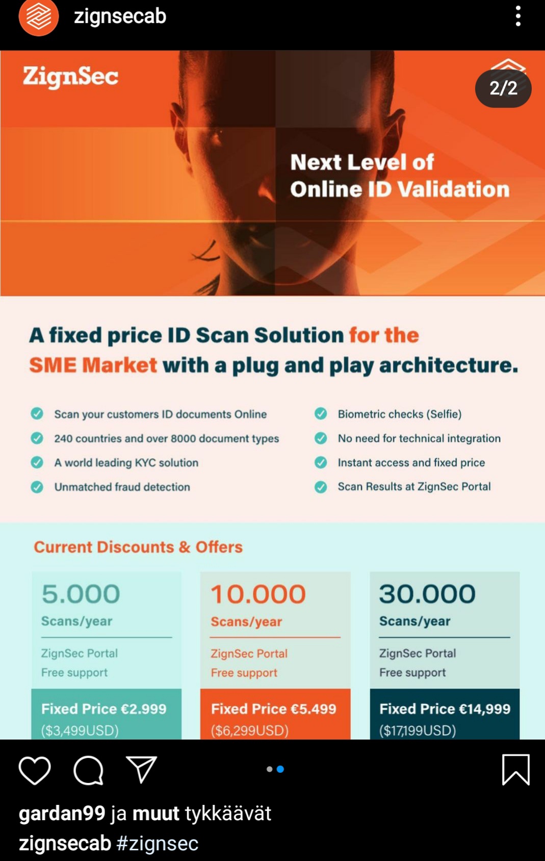 Den där prissättningen → t.ex. 30 000 skanningar / 15 000 € det vill säga 50 cent per skanning. En skanning innebär väl en identifiering? Känns som ett högt pris vid en första anblick? Men affärerna verkar gå bra… För stora kunder med hundratusentals / miljontals kunder, och kanske lika många skanningar (?), måste det naturligtvis finnas en transaktionskostnad på en helt annan nivå?